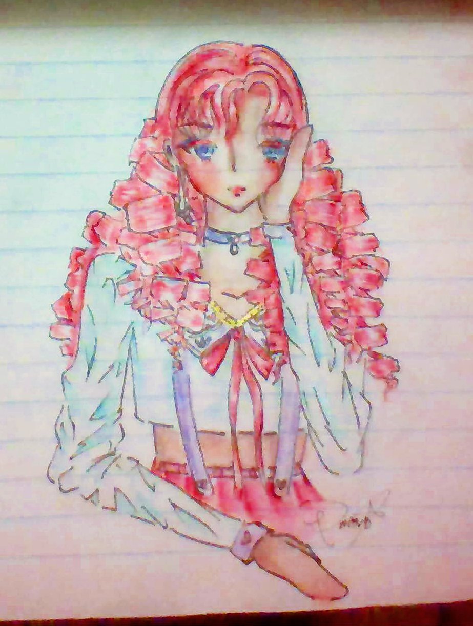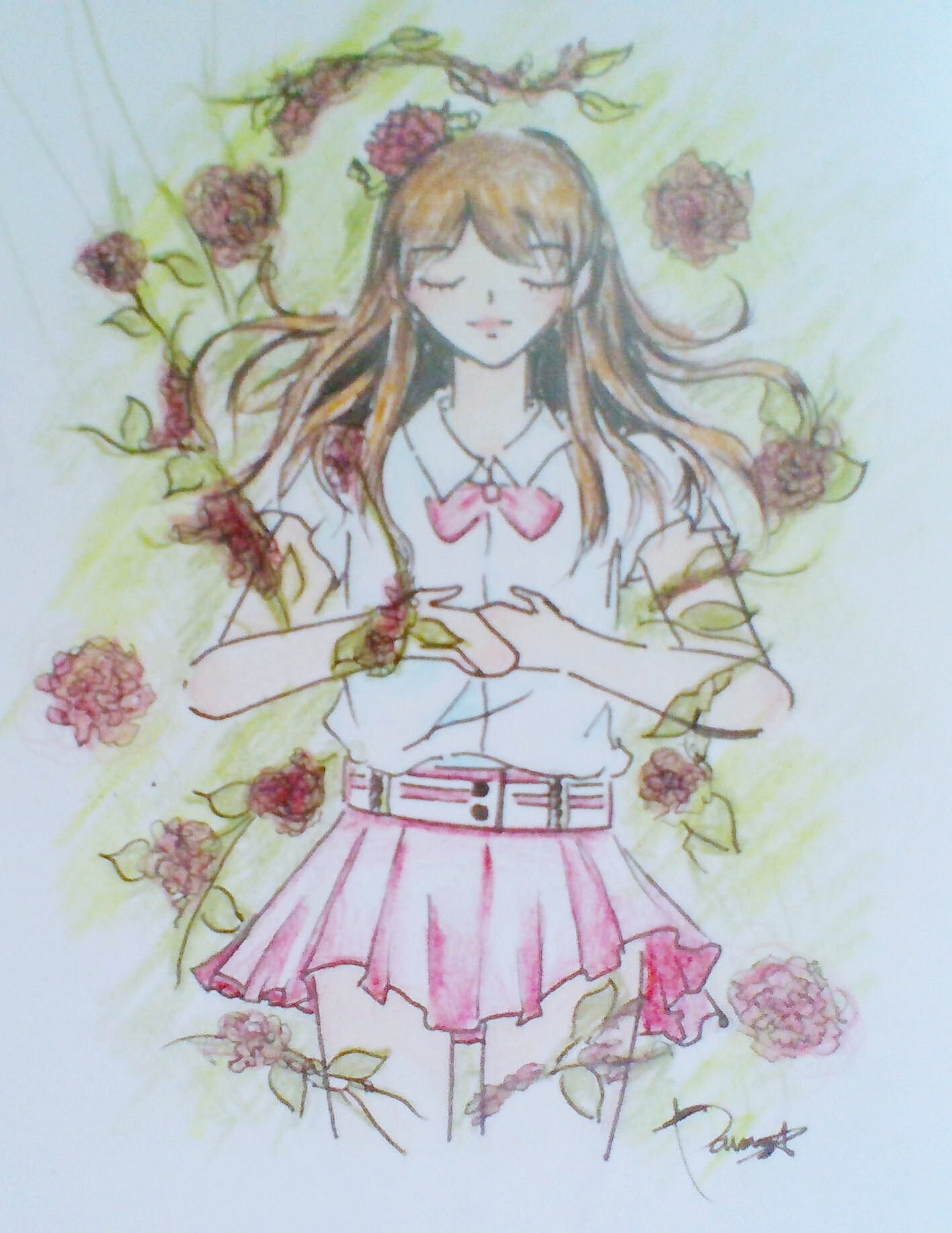 I finished the drawing until my baby neice took my green color pencil and scribbled on it Lol. I ended up making them flowers but the colors looks kinda messed up because of the layering (red and green . . . hahaha) ;-;